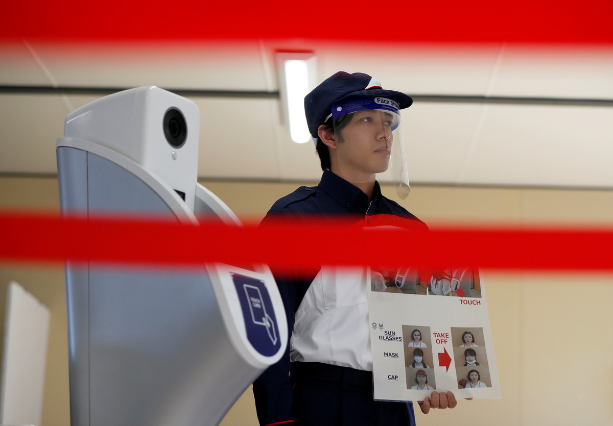 A security officer wearing a protective face shield conducts a test session of screening measures for games officials including coronavirus disease (COVID-19) countermeasures, hosted by Tokyo Organising Committee of the Olympic and Paralympic Games, ahead of the summer games that have been postponed to 2021 due to the disease outbreak, at Tokyo Big Sight, Japan October 21, 2020. REUTERS/Issei Kato