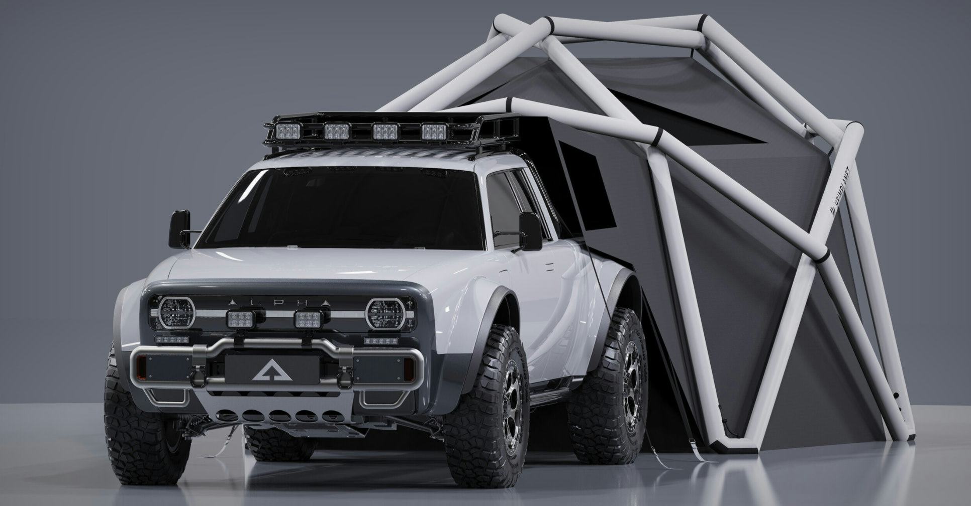 Take relative newcomers to the EV market, Alpha Motor Company, which has officially unveiled its partnership with the German outdoor aficionados at Heimplanet for an electric truck-camper mashup that is everything Tesla’s polygonal nightmare is not. Everyone, feast your eyes on the Alpha WOLF+ and its accompanying Cloudbreak™ Geodisic Tent. Look upon Alpha’s work, ye Technoking, and despair.