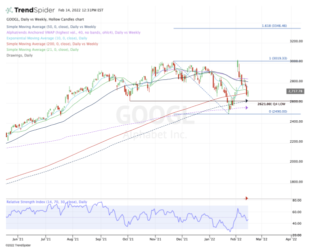 But it’s trying to find its footing. Should the selling in the overall market accelerate, Alphabet stock could be looking at a test of the 50-week moving average and the fourth-quarter low.