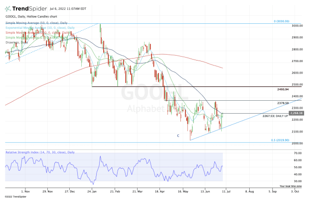 The June high sits up near $2,387. If Alphabet stock runs to $2,375, then a monthly-up rotation isn’t that far off. If that triggers, it could open the door to $2,500, which was major support in the first quarter.
