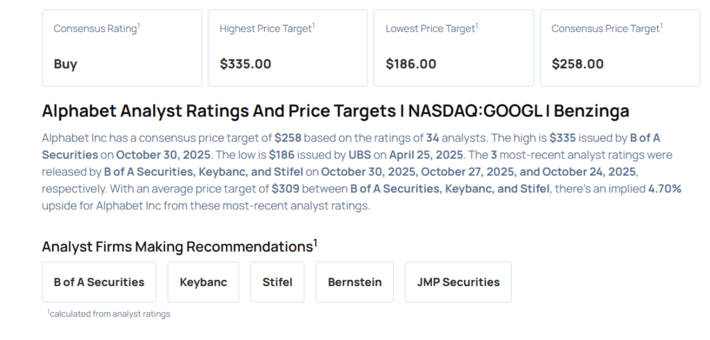 - B of A Securities boosted Alphabet Inc (NASDAQ:GOOGL) price target from $280 to $335. B of A Securities analyst Justin Post maintained a Buy rating. Alphabet shares closed at $274.57 on Wednesday. See how other analysts view this stock.