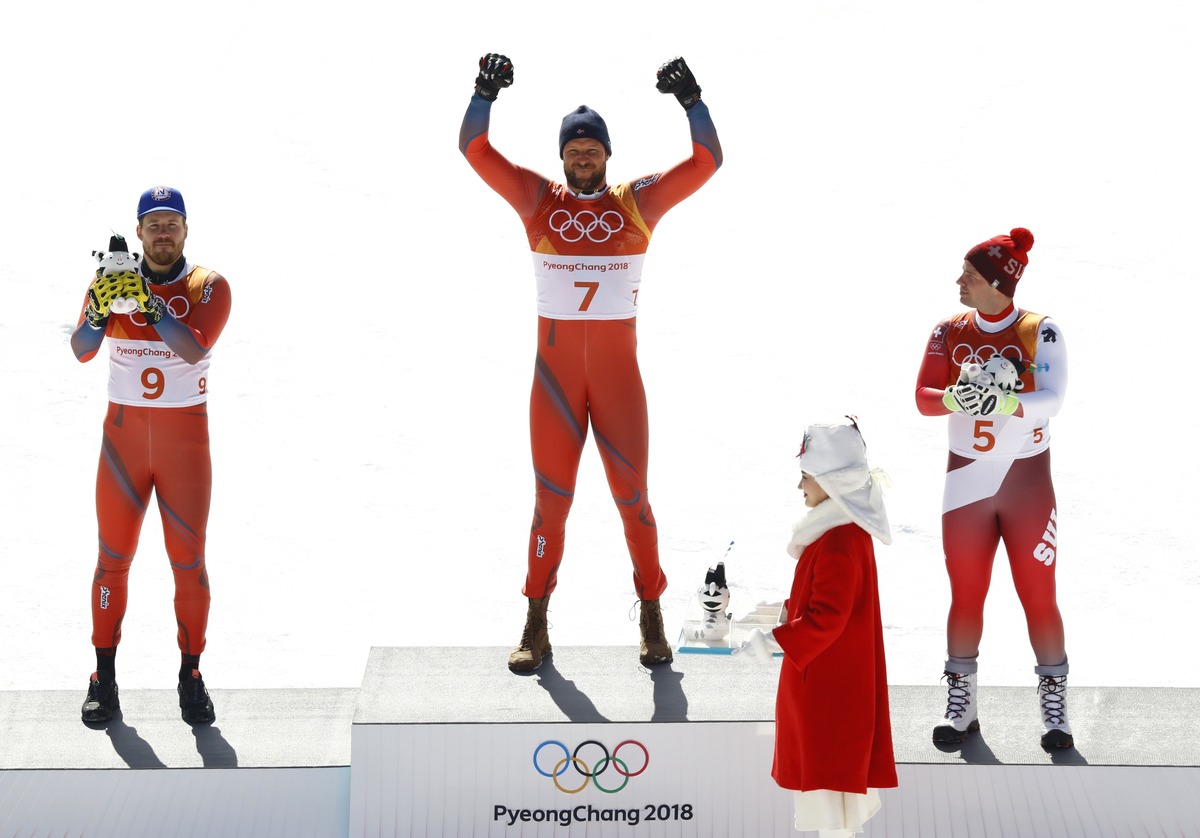 Jansrud's loss of control on the final jump probably cost him the gold as he finished 0.12 seconds behind his team mate in 1:40.37, with Feuz third in 1:40.43.