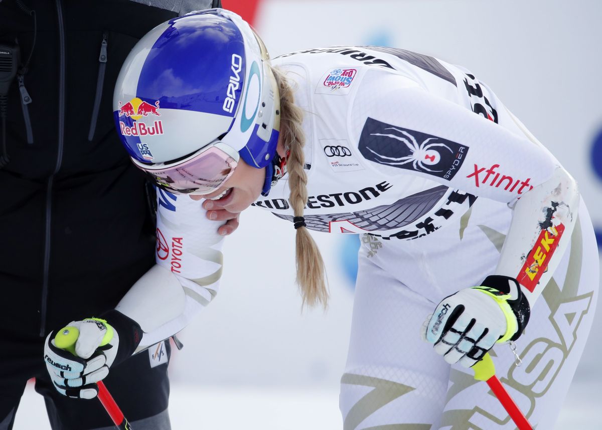 Vonn, four-times overall World Cup champion and the finest woman skier of her generation, fell to the ground grimacing as she slowed down after the finishing line and she staggered away with what appeared to be either a hip or back injury.