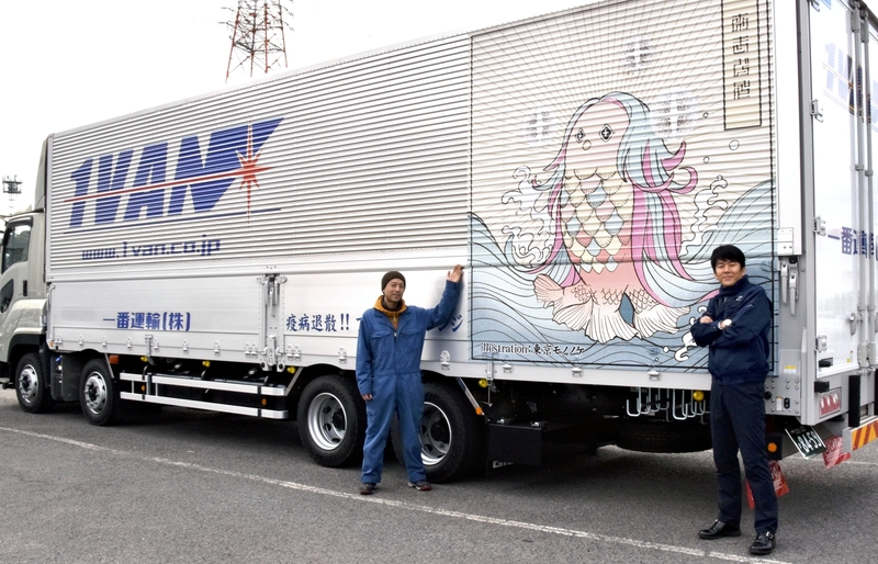 Ichiban Unyu, a transport company in Oita, has adorned the sides of a truck of the company with an image of Amabie.