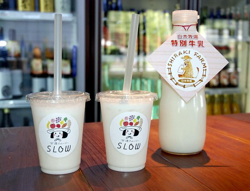 Located in a nearby farmers market, the shop serves up refreshing amazake smoothies developed by the brewery to showcase local ingredients, such as the locally sourced Jersey milk featured in their first menu item. Priced at 400, yen the smoothie is served in a cup of about 300 milliliters, and is made with Jersey milk from the Shiraki Farm agricultural cooperative in the city.