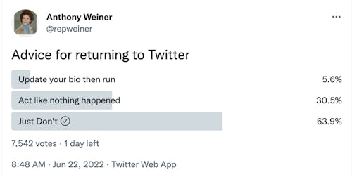 That’s how it usually works. This week, however, the heavy lifting was done for me, with former United States congressman Anthony Weiner (he of “absolutely could not stop sexting people to the point of total absurdity” fame) returning to the scene of the crime — Twitter — to literally ask whether or not he should log off again after spending nearly a decade offline. It’s like this week’s blog was prepared in a fancy gastropub kitchen by a Michelin-starred chef and served up to me on a silver platter with complimentary glass of champagne on the side.