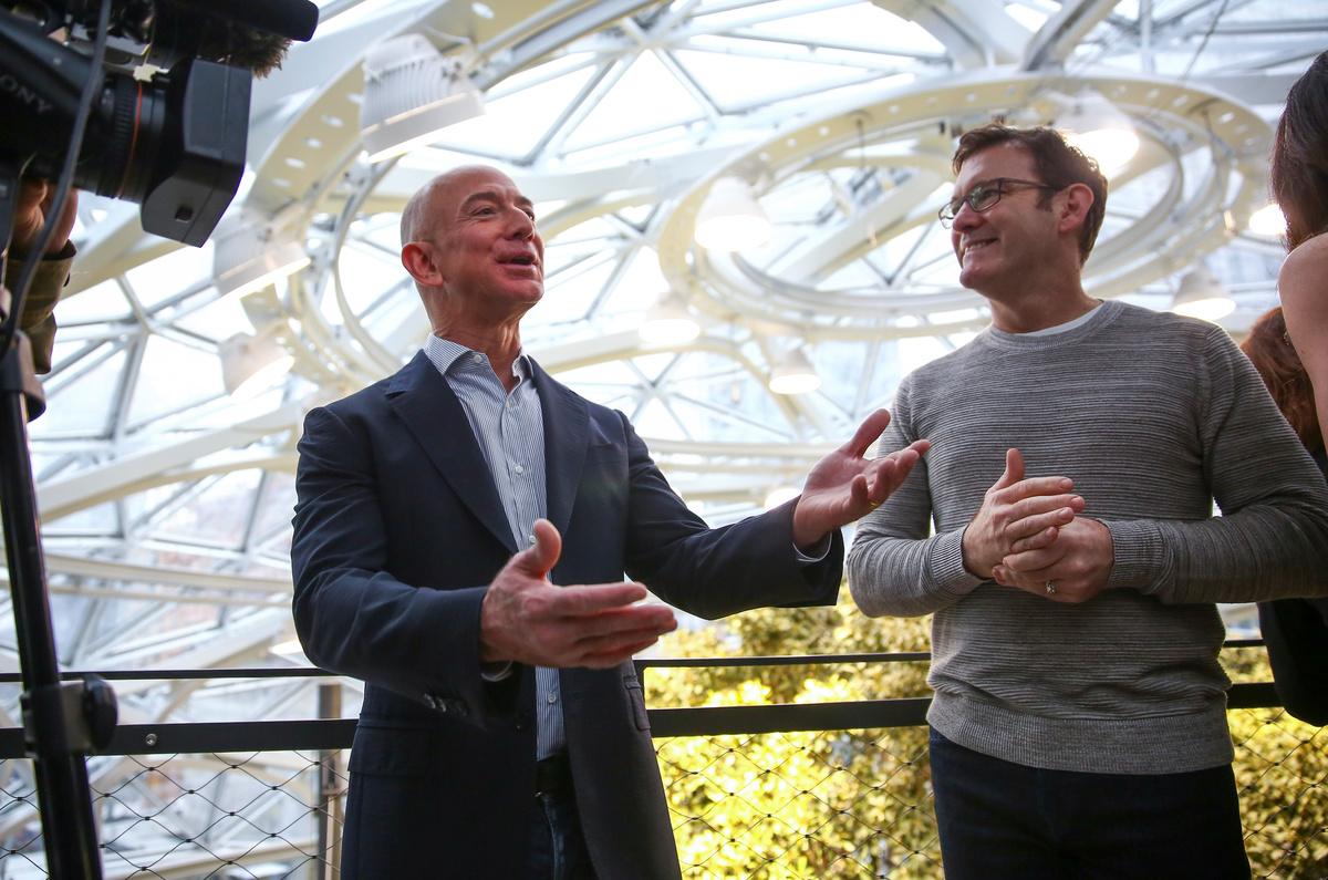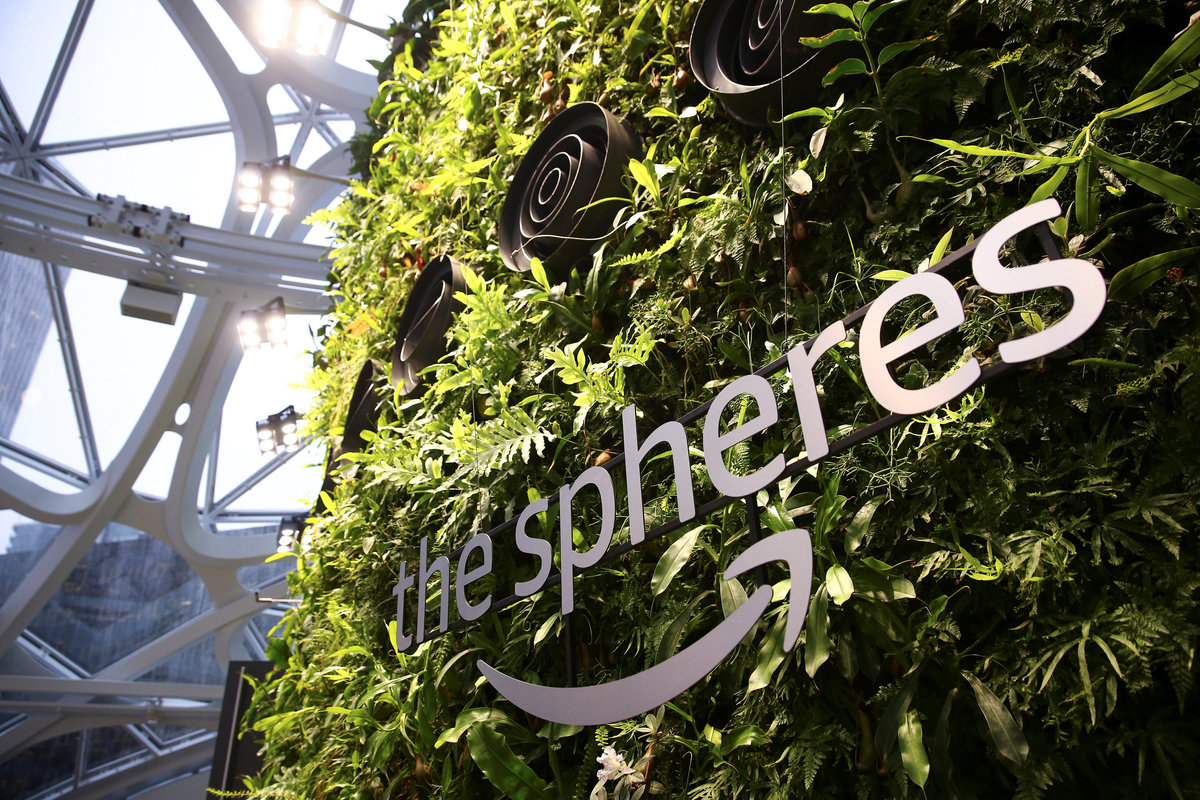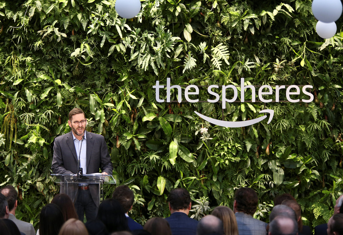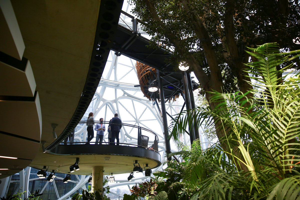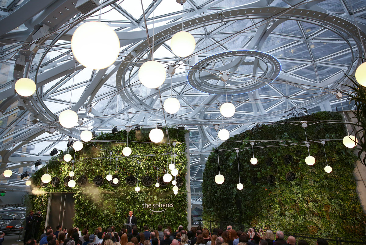 People tour the new Amazon Spheres, seen from the main floor, during an opening event at Amazon's Seattle headquarters in Seattle, Washington, U.S., January 29, 2018. The Spheres, made up of 2,643 glass panels, house over 40,000 plants from 400 species. REUTERS/Lindsey WassonPeople tour the four main floors of the new Amazon Spheres, a 60-feet high living wall at left, during a grand opening event at Amazon's Seattle headquarters in Seattle, Washington, U.S., January 29, 2018. REUTERS/Lindsey WassonPeople tour the new Amazon Spheres, as seen from the main floor, during a grand opening event at Amazon's Seattle headquarters in Seattle, Washington, U.S., January 29, 2018. The Spheres, made up of 2,643 glass panels, house over 40,000 plants from 400 species. REUTERS/Lindsey WassonAmazon founder and CEO Jeff Bezos (L) answers a question from the media while getting a tour from Ron Gagliardo, senior manager of horticultural services for the Spheres, during the Amazon Spheres opening event at Amazon's Seattle headquarters in Seattle, Washington, U.S., January 29, 2018. REUTERS/Lindsey WassonAmazon founder and CEO Jeff Bezos walks by a crowd of media as he tours the Amazon Spheres during their grand opening event at Amazon's Seattle headquarters in Seattle, Washington, U.S., January 29, 2018. REUTERS/Lindsey WassonA stem cutting at the new Amazon Spheres opening event at Amazon's Seattle headquarters in Seattle, Washington, U.S., January 29, 2018. The Spheres, made up of 2,643 glass panels, house over 40,000 plants from 400 species. REUTERS/Lindsey WassonA Spheres logo sits on a living wall on the top floor of the new Amazon Spheres during a grand opening event at Amazon's Seattle headquarters in Seattle, Washington, U.S., January 29, 2018. REUTERS/Lindsey WassonAmazon real estate vice president John Schoettler, running the company's HQ2 search, speaks at the new Amazon Spheres opening event at Amazon's headquarters in Seattle, Washington, U.S., January 29, 2018. REUTERS/Lindsey WassonAmazon founder and CEO Jeff Bezos gives some closing comments after opening the new Amazon Spheres with some help from Alexa during an opening event at Amazon's headquarters in Seattle, Washington, U.S., January 29, 2018. REUTERS/Lindsey WassonAmazon real estate vice president John Schoettler, running the company's HQ2 search, speaks at the new Amazon Spheres opening event at Amazon's headquarters in Seattle, Washington, U.S., January 29, 2018. REUTERS/Lindsey WassonAmazon founder and CEO Jeff Bezos gives some closing comments after opening the new Amazon Spheres with some help from Alexa during an opening event at Amazon's Seattle headquarters in Seattle, Washington, U.S., January 29, 2018. REUTERS/Lindsey WassonThe new Amazon Spheres are seen from the lower level entrance after an opening event at Amazon's Seattle headquarters in Seattle, Washington, U.S., January 29, 2018. REUTERS/Lindsey WassonThe Amazon Spheres are seen from Lenora Street, at Amazon's Seattle headquarters in Seattle, Washington, U.S., January 29, 2018. REUTERS/Lindsey Wasson