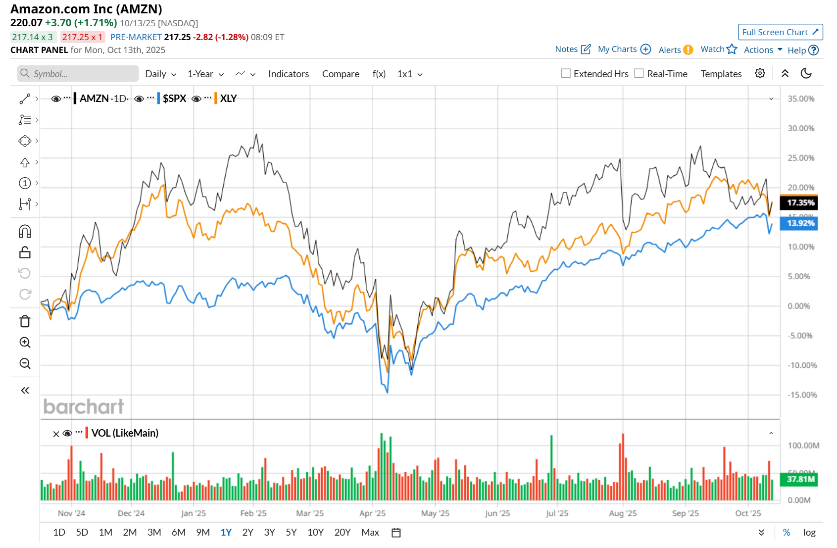 AMZN has outpaced the S&P 500 Index's ($SPX) 14.4% return over the past 52 weeks, with its shares up 15.6% over the same time frame. However, it has trailed behind the Consumer Discretionary Select Sector SPDR Fund’s (XLY) 17% uptick over the same time period.