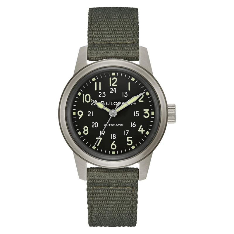 Military-style watches are popular because they have a history behind them, but also because they're highly legible. The matte black dial has 12-hour and 24-hour tracks so you can utilize both civilian and military time. Glow-in-the-dark lume can be found on the hands and the Arabic numerals on the dial. The watch is powered by an automatic movement, which means that it works on kinetic energy supplied by the motion of your hand. No battery is needed. It includes a commemorative caseback, which pays homage to what the brand calls its "unique military heritage."