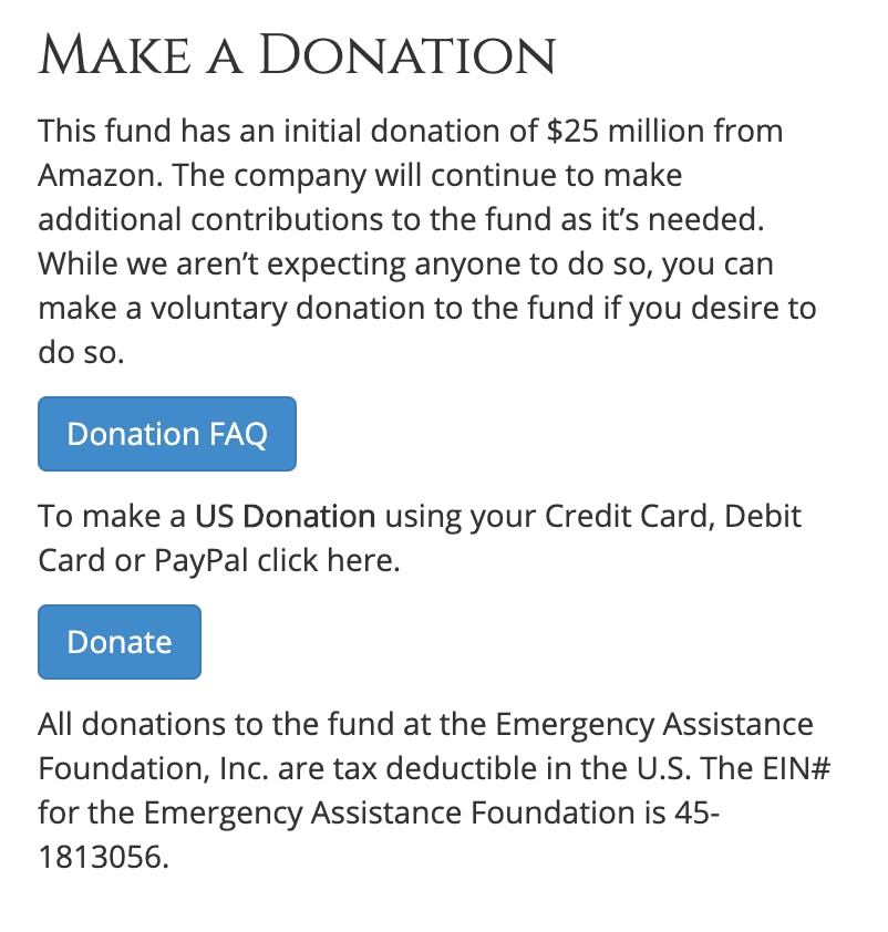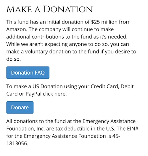 The Amazon Relief Fund claims that it is "focused on supporting our United States-based Delivery Associates employed by Delivery Service Providers, our Amazon Flex Delivery Partners, and Associates working for Integrity Staffing, Adecco Staffing, and RES Staffing, and drivers and support team members of line haul partners under financial distress due to a COVID-19 diagnosis or quarantine."
