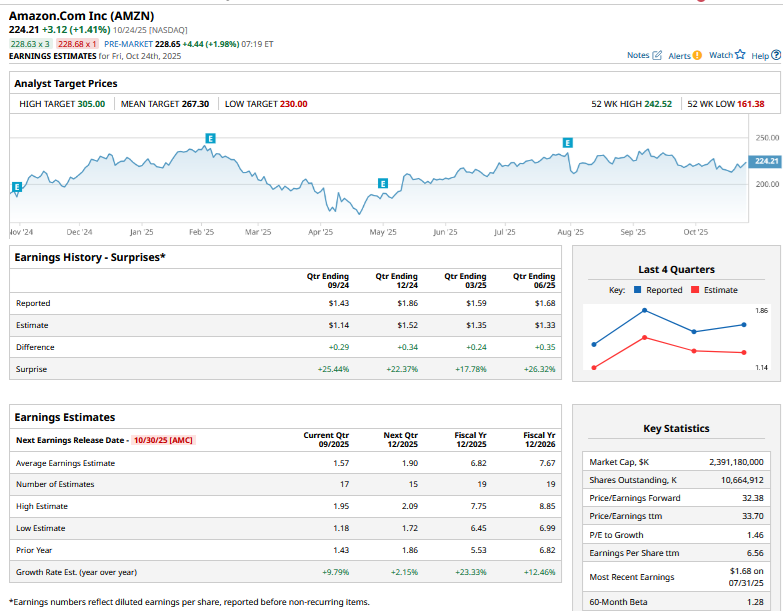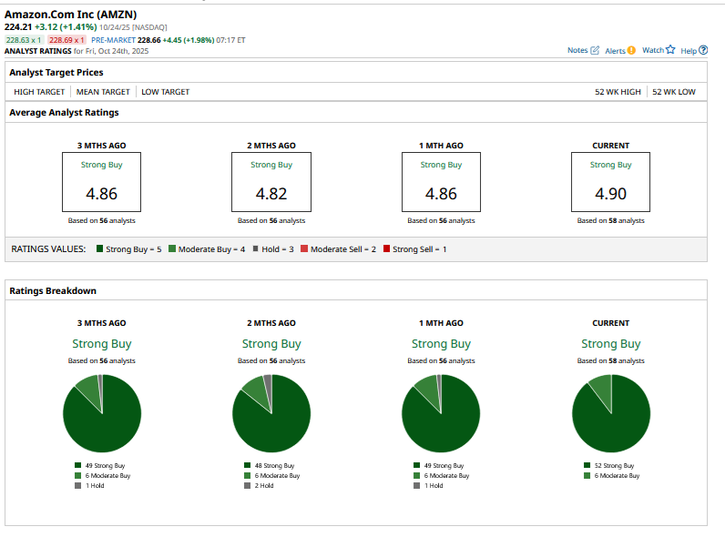 Several brokerages, including Goldman Sachs, KeyBanc, Stifel, and Wedbush, have raised Amazon’s target price this month. Amazon – which only has “Buy” or higher ratings from the 58 analysts polled by Barchart – has a mean target price of $267.30, which is 19.2% higher than current levels. The stock’s Street-high target price of $305 is over 36% higher.