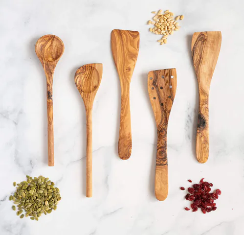 Upgrade your cooking utensils with this gorgeous set of olive wood spoons and turners that work great while looking just as good. Each handmade utensil is 12 inches long, and the set includes a flat spatula, spoon, slotted spatula, corner spoon, and curved spatula.