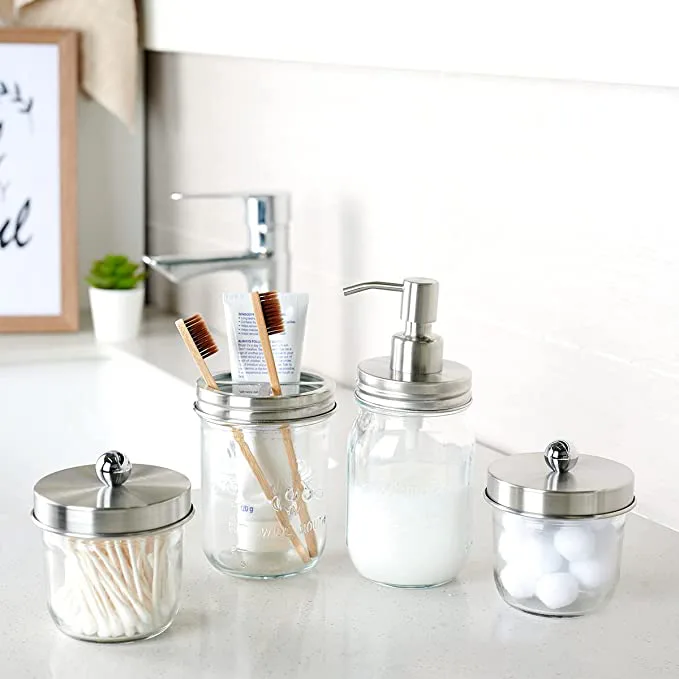 Few things can tie your vanity and sink area together like matching bathroom accessories. This elegant set includes a toothbrush holder, reusable soap pump, plus two jars with matching lids. Each jar is made of glass, while the lids — available in three colors — are durable stainless steel.