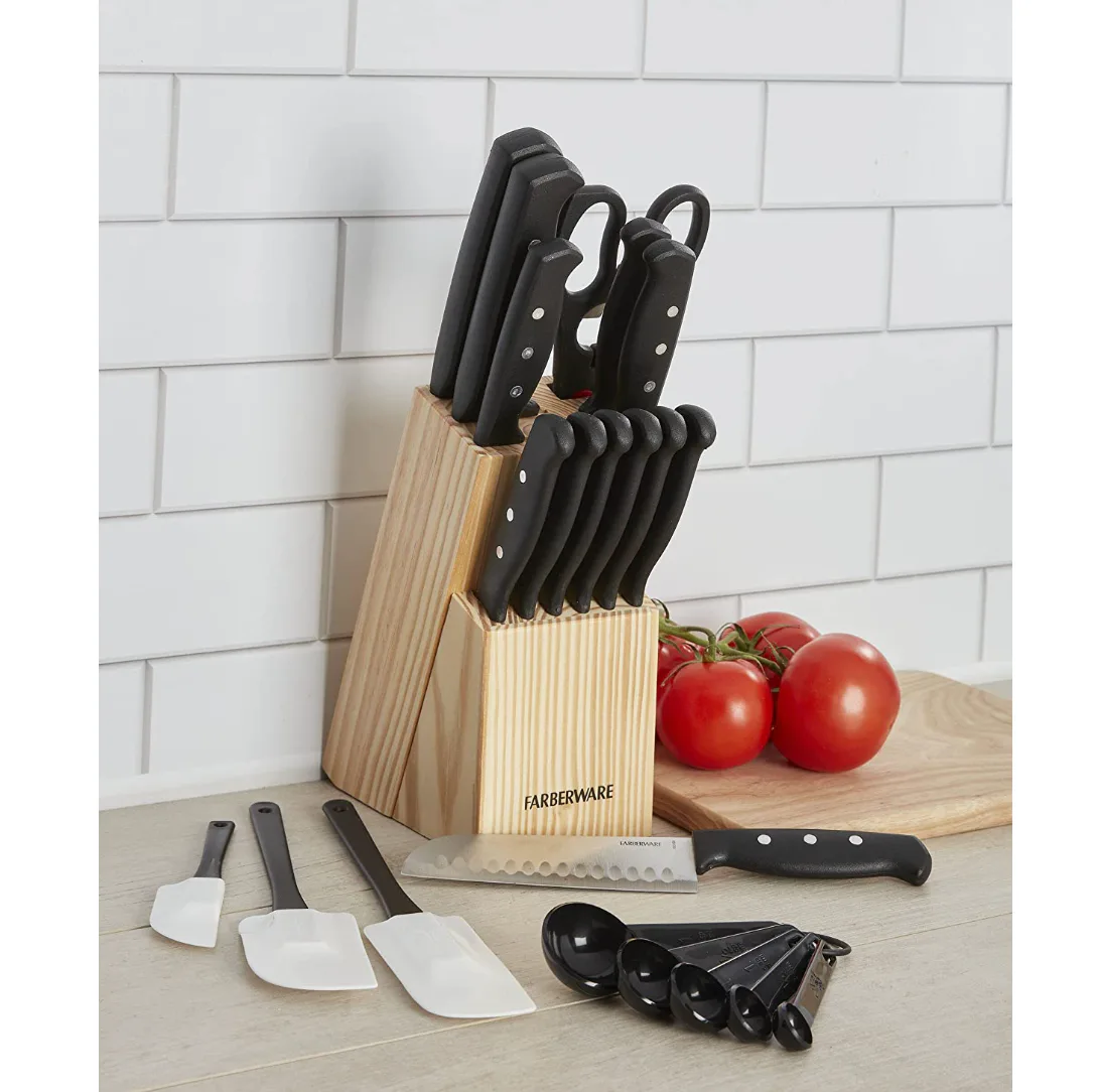 This versatile knife and tool set includes multiple styles of knives, plus kitchen shears, measuring spoons, and spatulas. The included wooden block holds nearly all of it, so the tool you need will be right within reach. Choose between sets that never need sharpening, or that include a sharpener for your convenience.