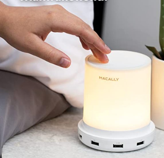 This is the ideal desk or bedside table lamp because it’s small and cute, is easy to control with a touch, and has four USB charging ports built into the base. Just tap the top to turn it on, off, or to change the brightness. It eliminates clutter on your table because you don’t need an additional charger plug and its four USB plugs support fast charging.