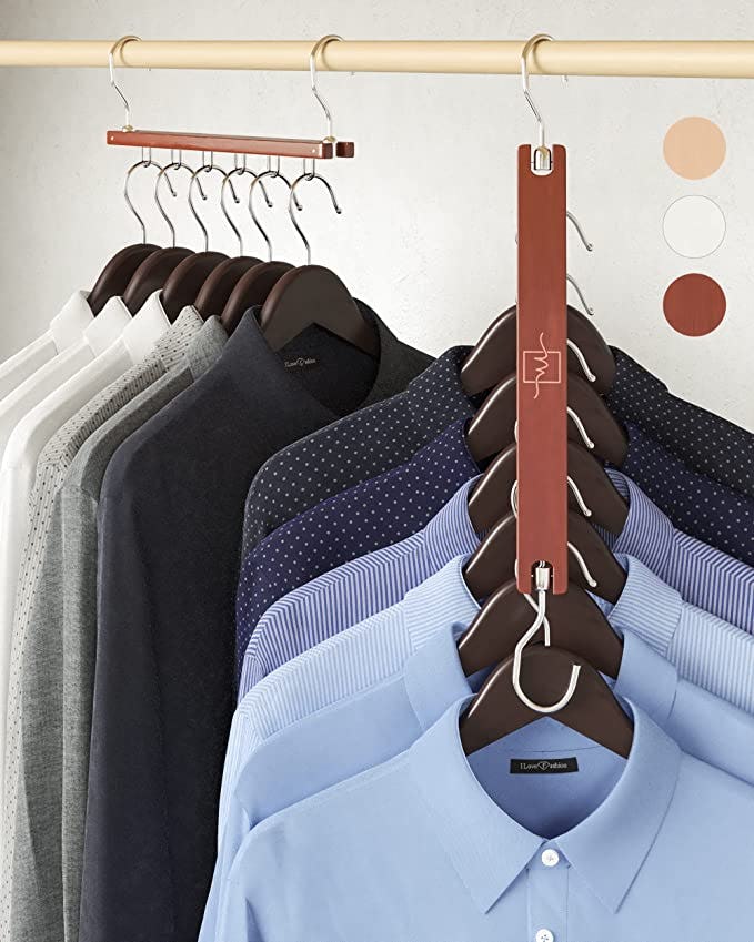 Create space in your closet, while organizing your wardrobe for easier dressing, with these four wooden shirt organizers. Just hang them horizontally from your closet rod to load six shirts onto them. The metal loops keep hangers from falling off. Then unhook one side of the organizer from the rod and let your shirts hang vertically so you can see them all at once. Your wardrobe will take up much less space and the hangers turn 360 degrees so it’s easy to rifle through your clothing options.