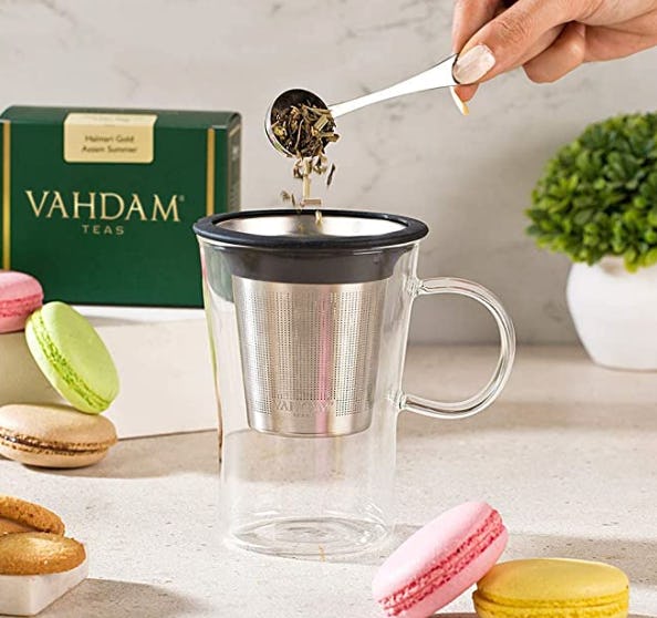 28. This clear teacup with an infuser & lid for a fresh cup anytime