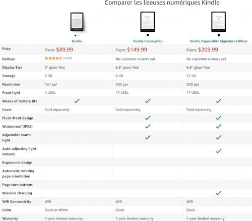 Both the new Paperwhite and the Paperwhite Signature have been gifted some small but meaningful upgrades. The most impressive of them are reserved for the more expensive Paperwhite Signature Edition, which is listed in this chart at 209.99 CAD (about $164) — running about $50 more than the new Paperwhite 5.