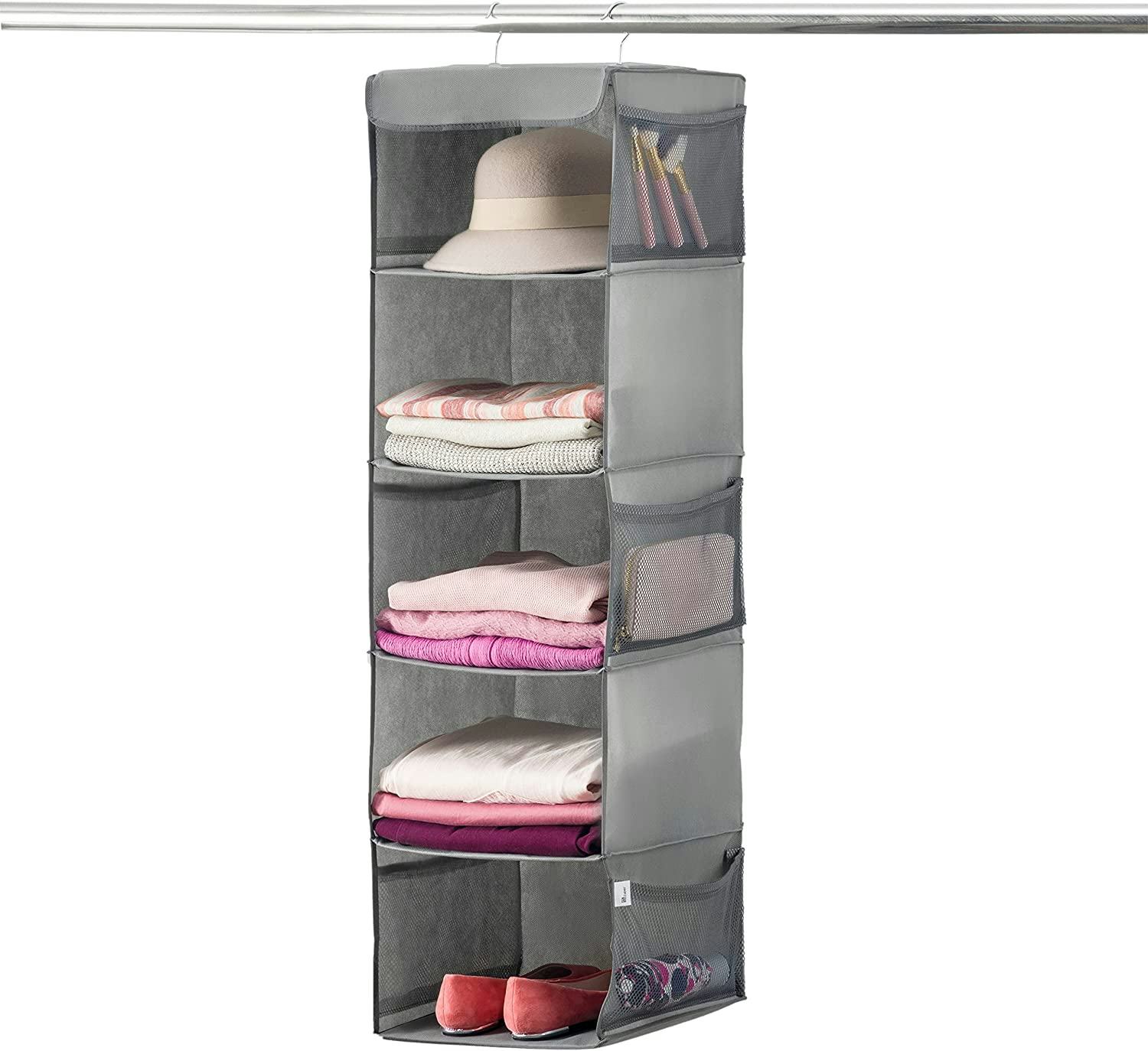 If you have a tiny closet or no room for a dresser in your room, consider this hanging organizer with five roomy shelves to help store all of your clothes and accessories. This fabric organizer takes up only two hangers but takes full advantage of all the unused vertical space in your closet to comfortably store folded clothes, purses, and even shoes.