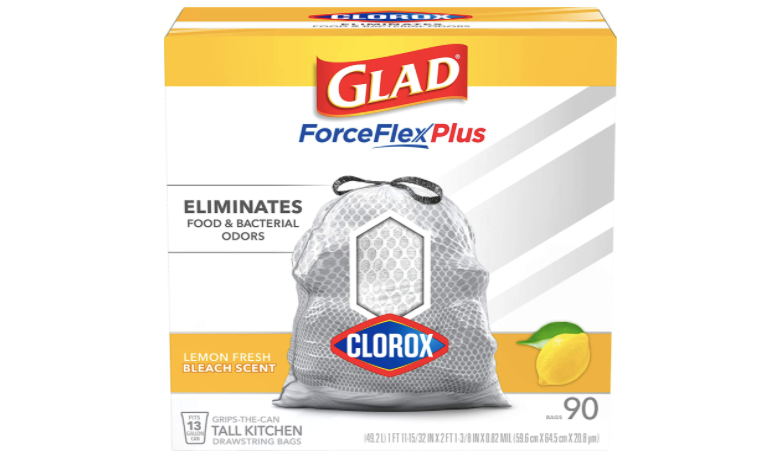 Glad Tall Kitchen Trash Bags ForceFlex Plus with Clorox, 13 Gallon, Lemon Fresh Bleach Scent 90 Count (Package May Vary), White-gray, Lemon Fresh