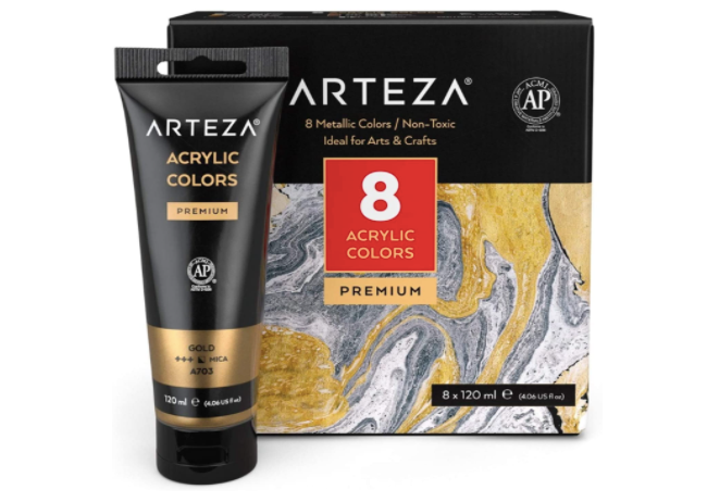 Arteza Metallic Acrylic Paint, Set of 8 Metallic Colors in 4.06oz/120ml Tubes