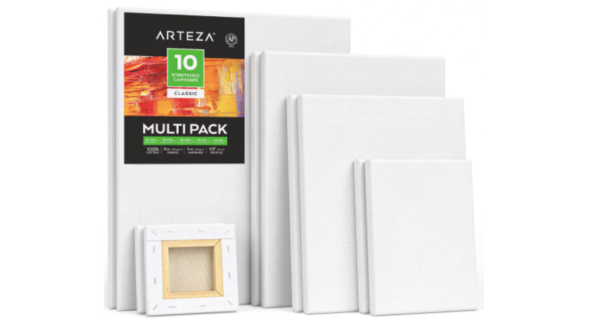 Arteza Stretched Canvas, Multipack of 10, 4x4, 5x7, 8x10, 9x12, and 11x14 Inches – 2 of Each, 100% Cotton, 8 oz Gesso-Primed, Art Supplies for Acrylic Pouring and Oil Painting