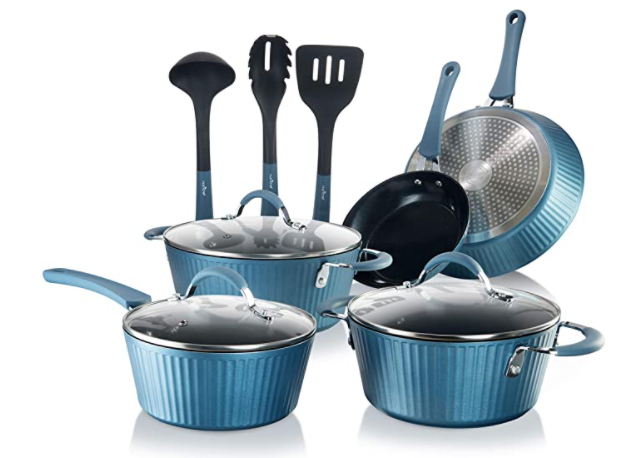 11 pieces of nonstick cookware for under $100 is a hard-to-beat deal, especially when you get a look at these beautiful blue pots and pans. Included in this limited time deal is: