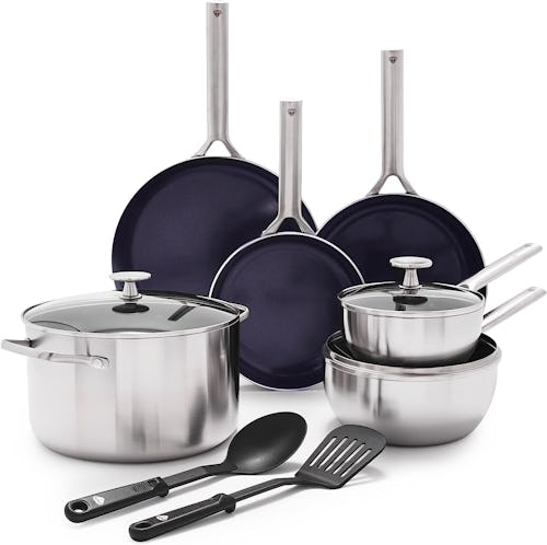 This stainless steel cookware set contains everything you need for a well-stocked kitchen: three frying pans, two chef's pans, a stock pot, a slotted turner, and a solid spoon. The cookware is made of high-quality stainless steel and nonstick ceramic, and all of the pieces are safe to put in the dishwasher and oven.