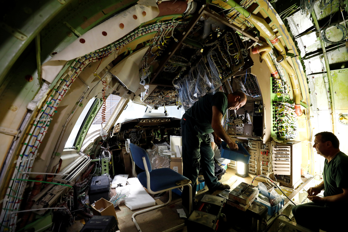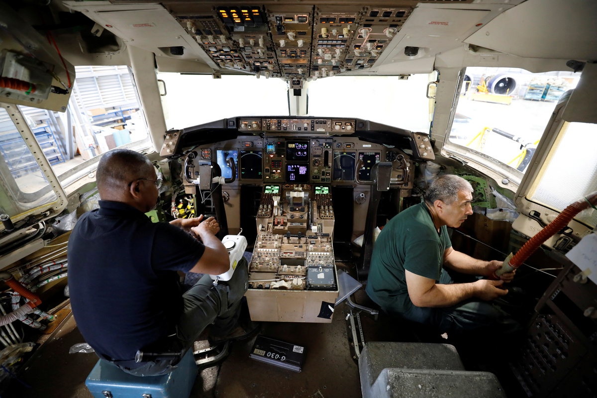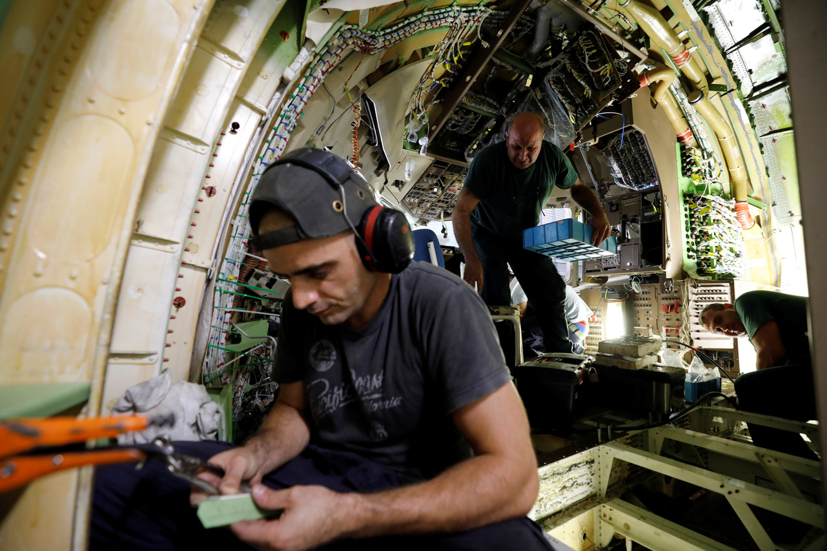 Labourers work inside the cockpit of a passenger plane as they convert it into a cargo plane at Israel Aerospace Industries site in Ben Gurion International Airport, Lod, Israel July 3, 2019. REUTERS/Amir Cohen