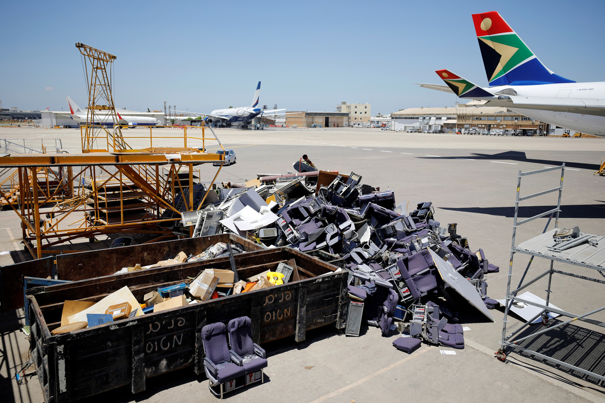 Airplane seats are seen near large garbage containers after they were removed from passenger planes that are being converted into cargo planes at Israel Aerospace Industries site in Ben Gurion International Airport, Lod, Israel July 3, 2019. REUTERS/Amir Cohen