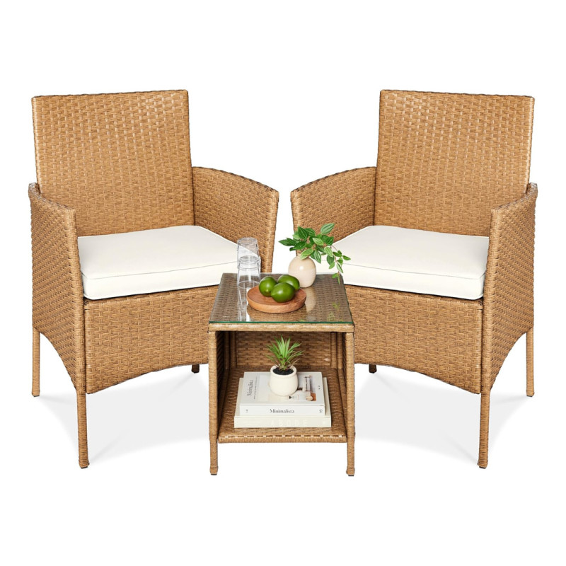 This three-piece set includes two wicker armchairs with removable cushions and a matching wicker side table with a tempered glass top. The table also features an additional storage shelf for displaying decor or stowing away magazines, card games, or blankets. It's the perfect setup for any outdoor space big or small since it doesn't take up a ton of room.