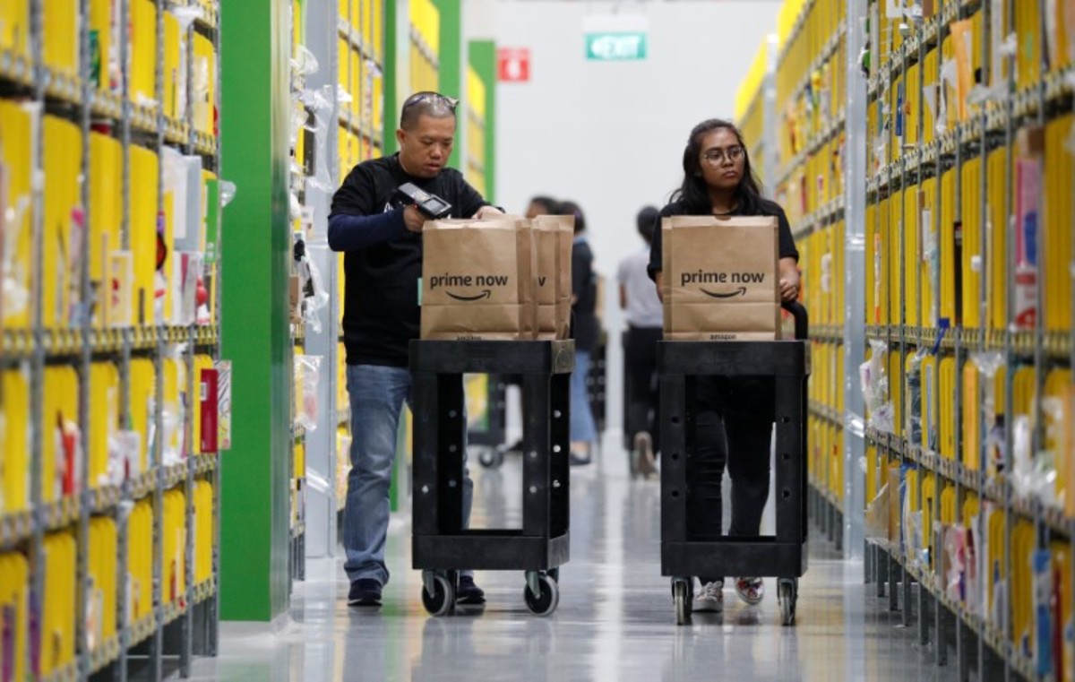 Employees work at Amazon's Prime Now fulfillment centre in Singapore July 27, 2017. REUTERS/Edgar SuAn employee works at Amazon's Prime Now fulfillment centre in Singapore July 27, 2017. REUTERS/Edgar SuEmployees sort out merchandise at Amazon's fulfillment centre ahead of the launch of their Prime Now service in Singapore July 27, 2017. REUTERS/Edgar SuEmployees work at Amazon's Prime Now fulfillment centre in Singapore July 27, 2017. REUTERS/Edgar SuPeople pass a signage at Amazon's Prime Now fulfillment centre in Singapore July 27, 2017. REUTERS/Edgar SuEmployees work at Amazon's Prime Now fulfillment centre in Singapore July 27, 2017. REUTERS/Edgar SuAn employee works at Amazon's Prime Now fulfillment centre in Singapore July 27, 2017. REUTERS/Edgar SuShelves of merchandise are pictured at Amazon's Prime Now fulfillment centre in Singapore July 27, 2017. REUTERS/Edgar SuA general view of a building housing Amazon's Prime Now fulfillment centre (C) in Singapore July 27, 2017. REUTERS/Edgar SuAn employee passes shelves of merchandise at Amazon's Prime Now fulfillment centre in Singapore July 27, 2017. REUTERS/Edgar SuThe Amazon Singapore website announcing deliveries in Singapore is seen in this illustration photo July 27, 2017. REUTERS/Thomas White/IllustrationA woman passes a wall sign at Amazon's Prime Now fulfilment centre in Singapore July 27, 2017. REUTERS/Edgar Su