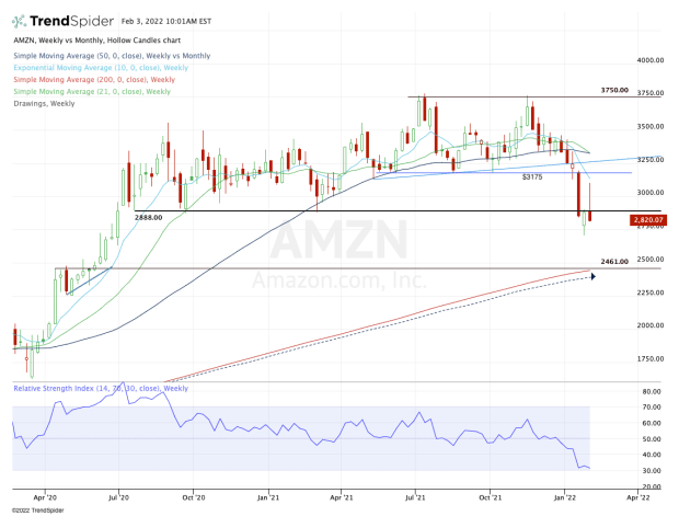 After uptrend trend support failed and Amazon broke below $3,175, it put range support back in play near $2,880, a level it hadn’t tested in almost a year.