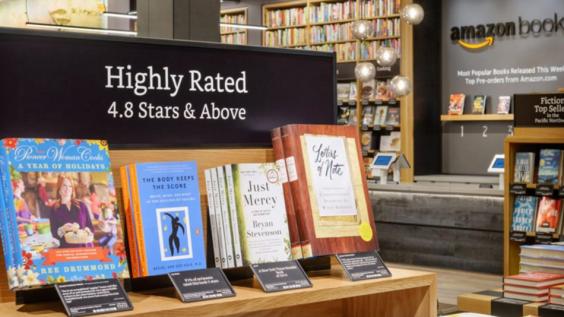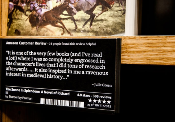 Placards featuring customer reviews from Amazon.com will be placed in front of each book, along with a star rating.