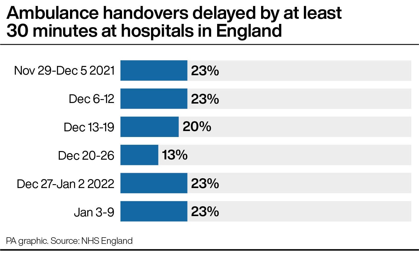 Meanwhile, nearly one in four patients arriving at hospitals in England by ambulance last week waited at least 30 minutes to be handed over to A&E departments.