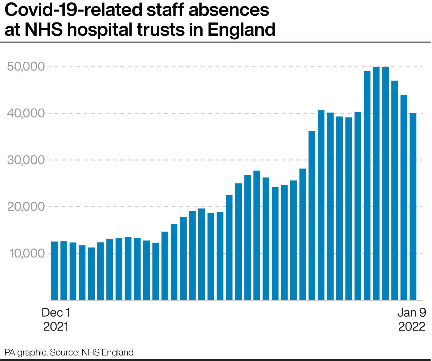 Absences related to Covid-19, including people who were self-isolating, climbed from 12,508 on December 1 to 40,149 on December 31.