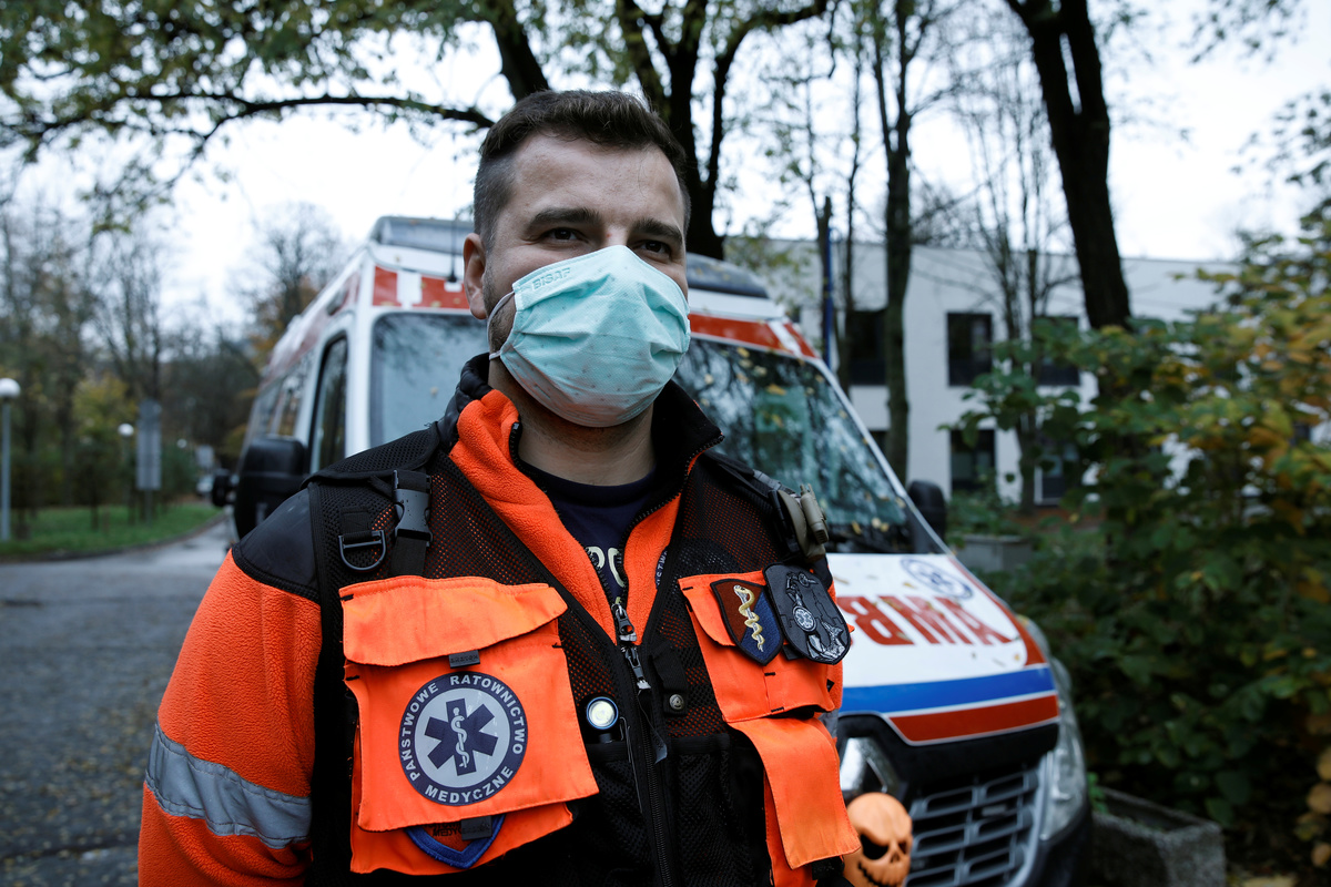 Marcin Serwach, an ambulance first responder from Warsaw, says he had to deliver oxygen at 3:00 a.m. to a colleague who spent 15 hours parked in front of a hospital with a patient in respiratory distress waiting to be admitted.