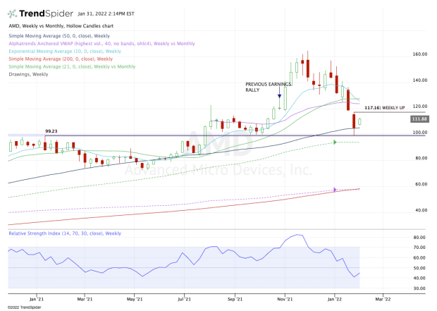 A retest of this zone could set up AMD stock for another bounce to the upside. A break of this area and failure to reclaim it puts the 21-month moving average in play.