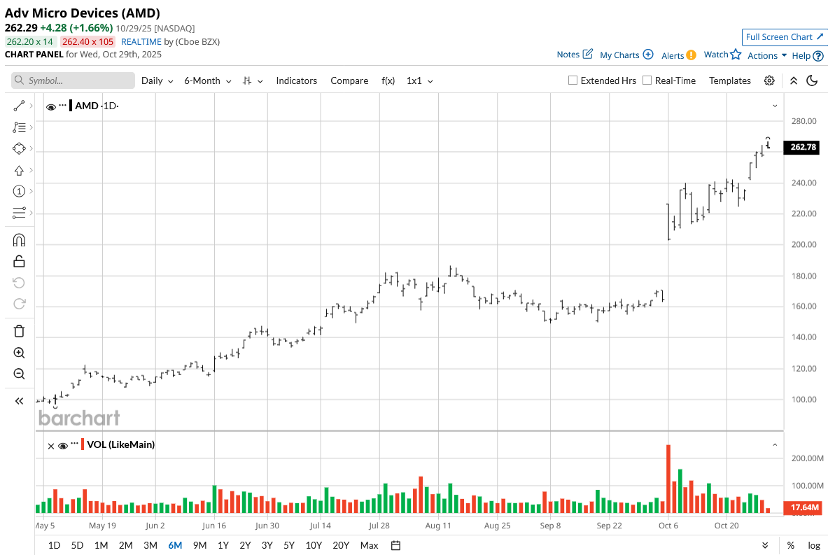 AMD is a maker of AI accelerators, CPUs, and GPUs and is based in Santa Clara, California. Its stock is touching new highs today, having already generated 118% returns through 2025. This results in an outperformance by 5.2x compared to the Nasdaq Composite’s ($NASX) year-to-date (YTD) returns of 24.2%. After touching a 2025 low of $76.48 in April, there has been a major spike as AMD stock has risen 244.7% since then. In the process, it has become one of the most trending stocks on Wall Street. A major jump occurred after the first week of October when the company announced its deal with OpenAI for AI chips over a multi-year period.