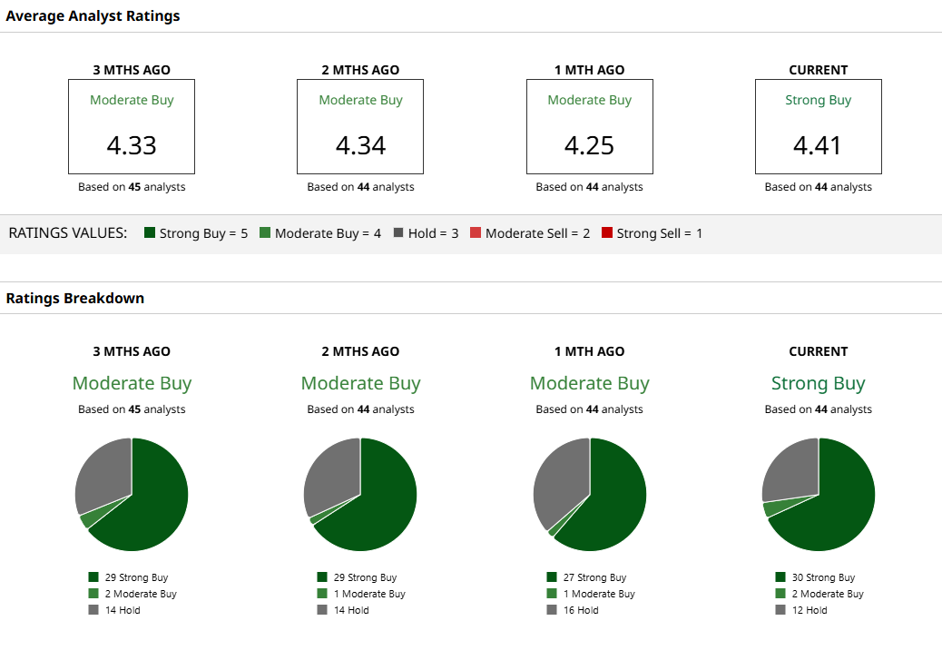 44 analysts cover AMD stock on Wall Street, and 30 of them have a “Strong Buy” rating, a bullish sentiment that is consistent with AI stocks. There are no “Sell” or “Strong Sell” ratings. The stock is trading just above the mean target price of $253.7, though about 18% below the highest target price of $310. AMD stock’s meteoric rise this year means upside seems limited. However, one should keep an eye on AMD analyst estimates as its MI300X AI accelerators continue to become popular.