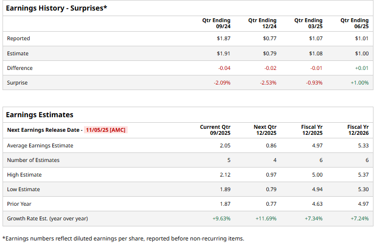 The utilities major is set to unveil its Q3 results after the market closes on Wednesday, Nov. 5. Ahead of the event, analysts expect AEE to report a non-GAAP profit of $2.05 per share, up 9.6% from $1.87 per share reported in the year-ago quarter. While the company has surpassed Wall Street’s earnings projections once over the past four quarters, it has missed the estimates on three other occasions.