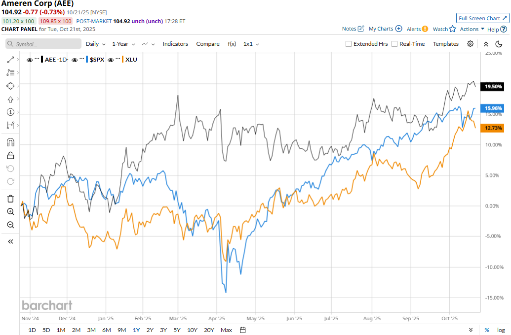 AEE stock prices have soared 18.9% over the past 52 weeks, notably outperforming the Utilities Select Sector SPDR Fund’s (XLU) 11% gains and the S&P 500 Index’s ($SPX) 15.1% returns during the same time frame.