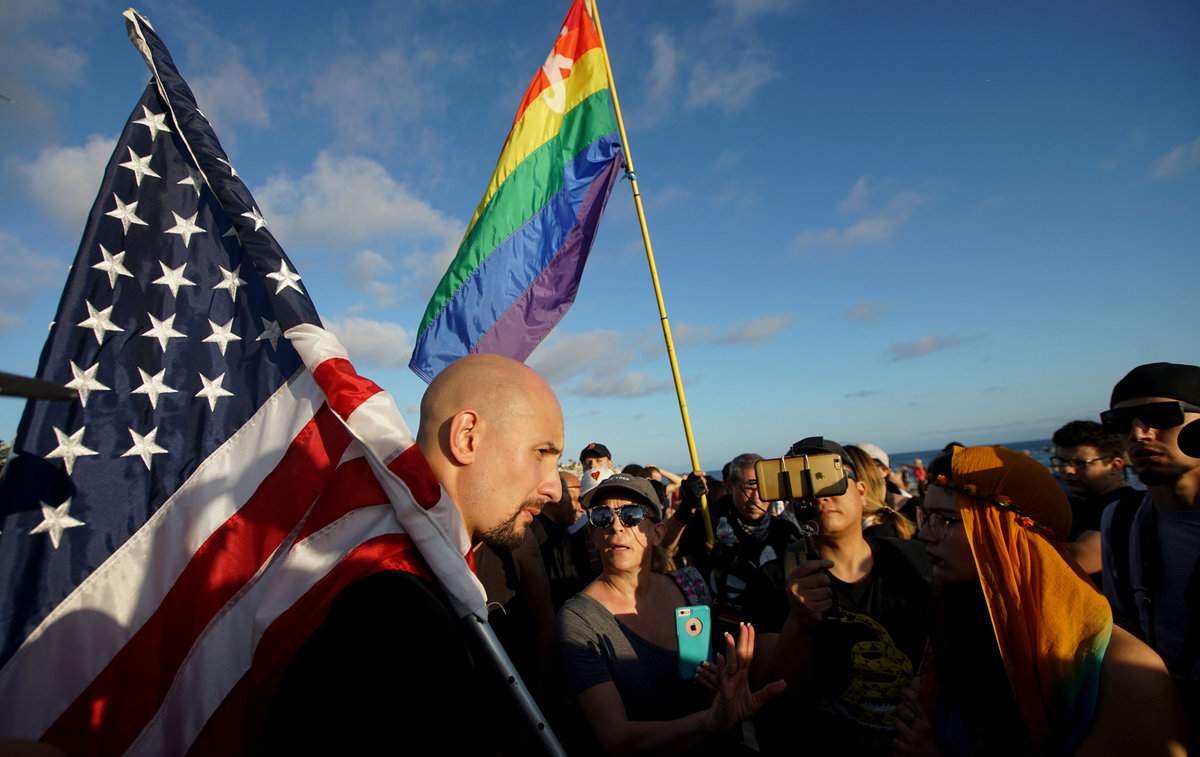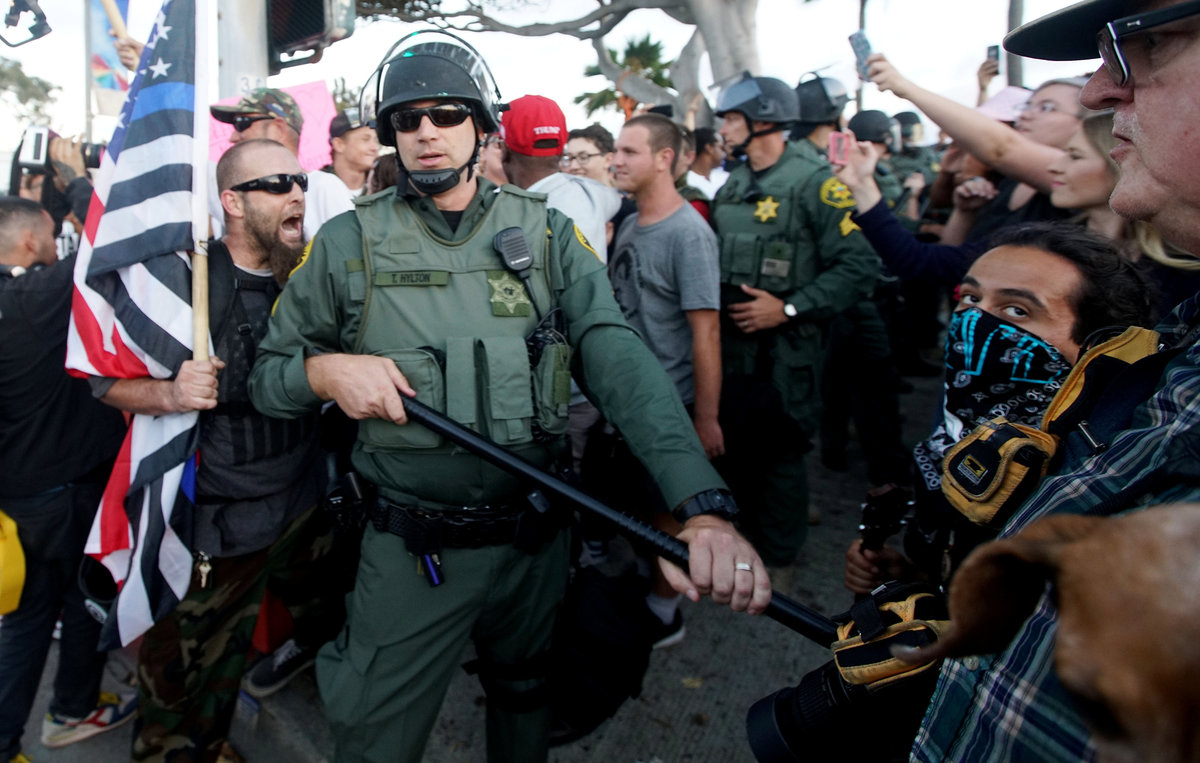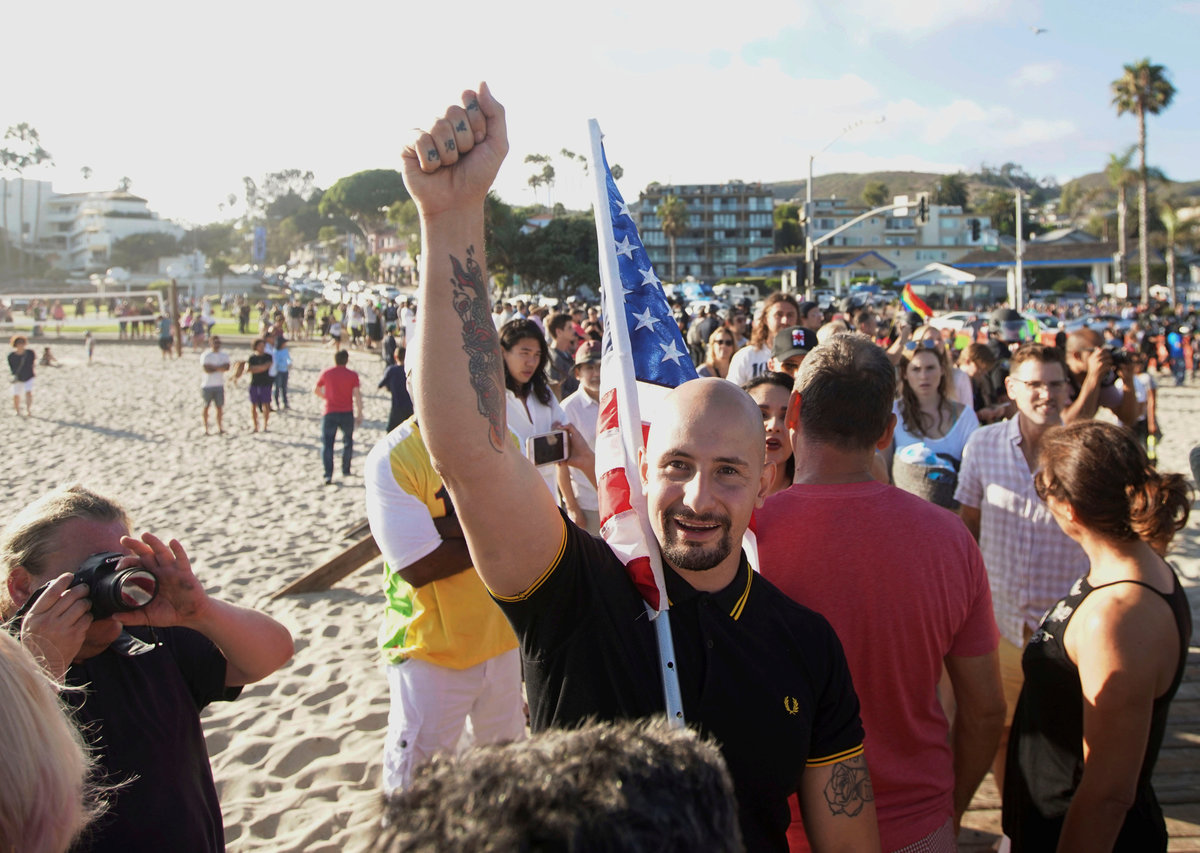 LAGUNA BEACH, Calif. (Reuters) - Anti-immigration demonstrators faced off against a much bigger crowd of counter-protesters in the Southern California town of Laguna Beach on Sunday, as police kept the opposing sides apart.