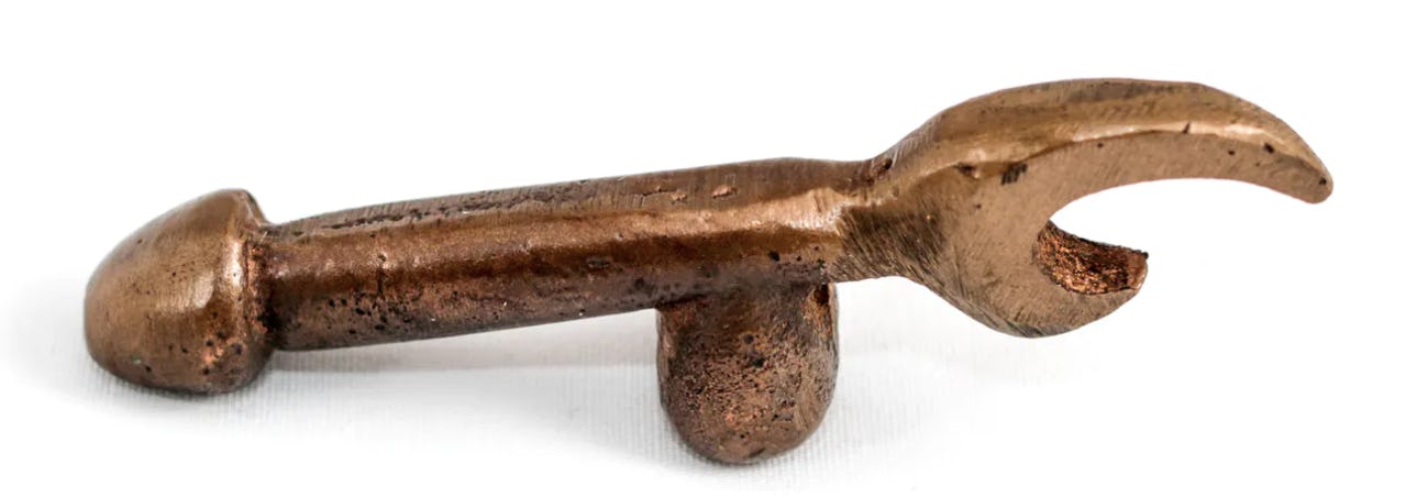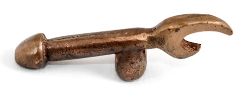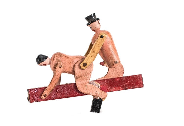 In many handmade objects, sexual gestures stand right behind propriety and erections pop up in staid places. For example, in the late 19th and and early 20th centuries, people made small, carved coffins as a form of memento mori that concealed carved figures inside. When you lift a coffin lid, the male figure’s erection pops up. The popular objects were hand-carved, hailing from places that still prepared their own dead for burial and still made coffins for neighbors and kinfolk. You can imagine them circulating discreetly at wakes and memorials, provoking laughter even as people mourned.