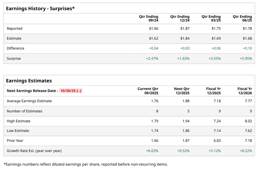 Berwyn, Pennsylvania-based AMETEK, Inc. (AME) manufactures and sells electronic instruments and electromechanical devices. Valued at $42.9 billion by market cap, the company manufactures advanced instruments for process, aerospace, power, and industrial markets, and is a supplier of electrical interconnects, specialty metals, technical motors and systems, and floor care and specialty motors. The leading global provider of industrial technology solutions is expected to announce its fiscal third-quarter earnings for 2025 in the near term.