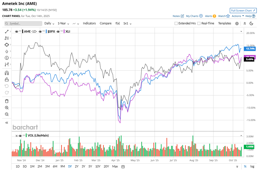 AME stock has underperformed the S&P 500 Index’s ($SPX) 13.4% gains over the past 52 weeks, with shares up 8.3% during this period. Similarly, it underperformed the Industrial Select Sector SPDR Fund’s (XLI) 10.1% gains over the same time frame.