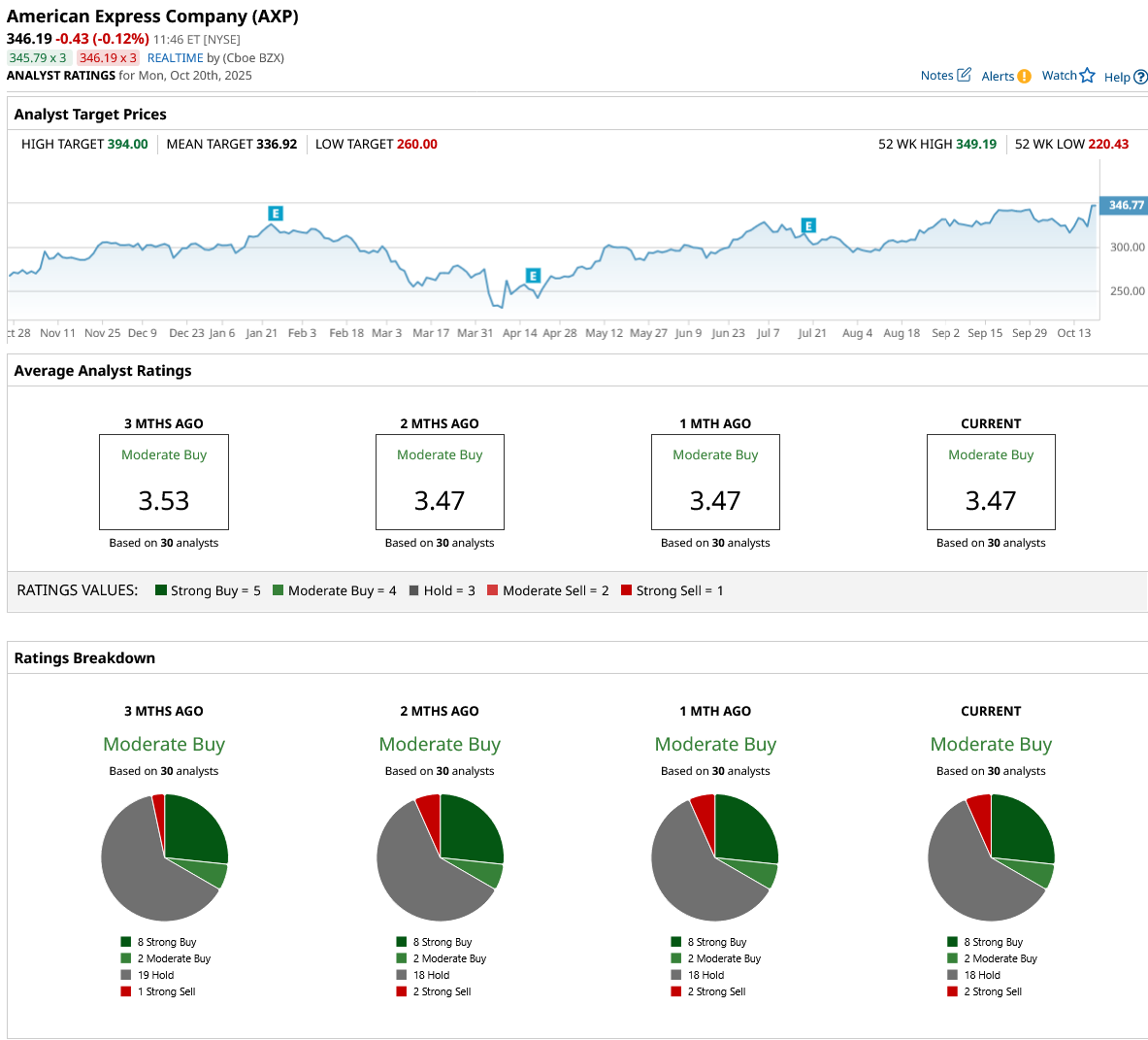Overall, Wall Street remains moderately bullish on AXP stock. Out of the 30 analysts who cover the stock, six rate it a “Strong Buy,” two say it is a “Moderate Buy,” 18 rate it a “Hold,” and two recommend a “Strong Sell.” The stock has surpassed its average price target of $336.92. However, its high target price of $394 implies a potential upside of 14% in the next 12 months.