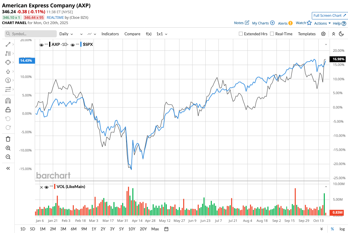 American Express (Amex) (AXP), the global financial services company, reported another robust quarter. Amex, best known for its credit cards, charge cards, and payment network, proved once again that its premium model and relentless innovation are paying off. In the third quarter, millennials and Gen Z accounted for 36% of total spending, matching Gen X. Amex stock has gained 16.6% year-to-date (YTD), surpassing the overall market index.