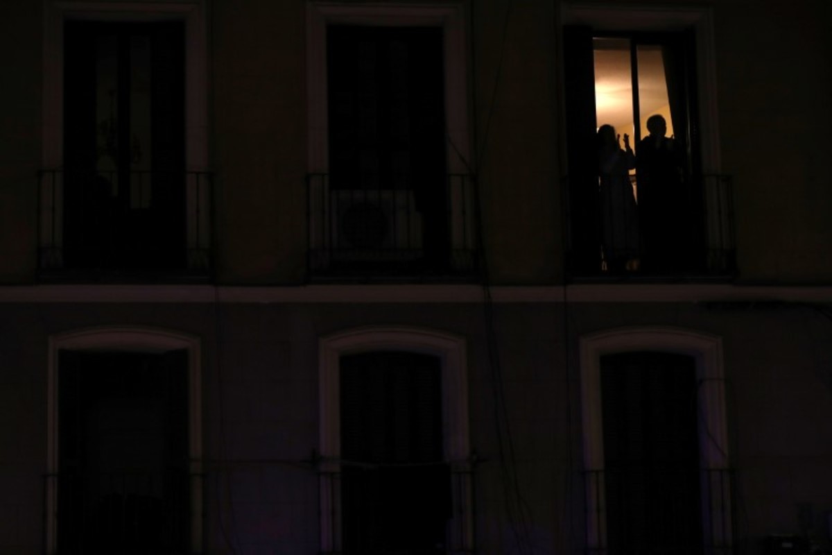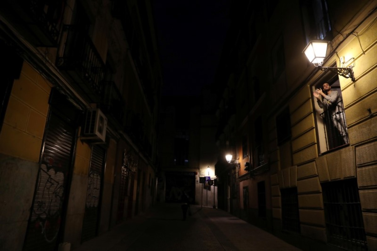 A man confined in his home claps as Spanish blues singer Beatriz Berodia "Betta" sings from her balcony next to guitar player Andrea Capalbo during a daily evening concert to support health workers and to make it easier for her neighbours to bear the coronavirus lockdown in Madrid, Spain, March 19, 2020. REUTERS/Susana Vera