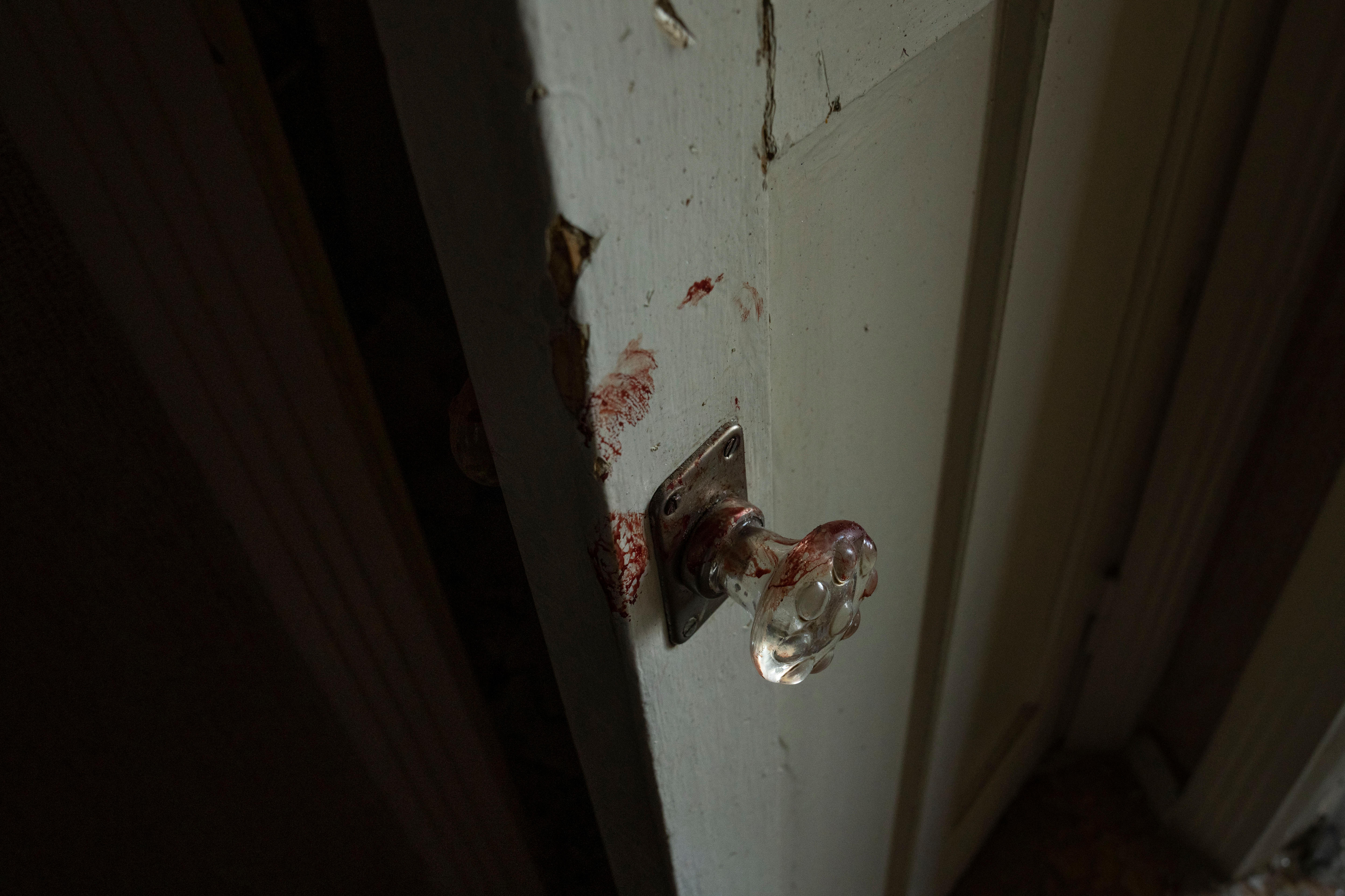 A body lies on the ground, covered by a sheet. Wounded residents sit dazed and covered in blood. A crater has been gouged in the centre of a once-calm, sunlit courtyard.